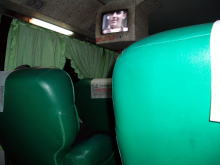 23:45、いよいよバス乗車。台湾はバス会社の競争が激しくて、各社様々な工夫を凝らして、集客数アップの努力をしている。中正機場→台中間は、まず統聯客運のバスを利用したが、車内はこんな感じ(写真左)。総統座席と呼ばれるソファーのような座席が左右各1つずつで、かなりゆとりのある配列。