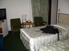 予約をしていなかったので、フロントに人が居なかったら・・・、万が一満室だったら・・・、深夜遅くだし荷物抱えたまま歩き回るの嫌だなーと思っていた。(と言いつつも、近くの富春(フーチュン)大飯店に行けばいいやーなんてお気楽に考えていた。)が、中に入るとフロントにはMr.オクレ似の英語全くNGのおっちゃんが眠そうな顔をして立っていて、シングルルームは満室だけれど、ツインの部屋なら泊まれるとのこと。この際、何でもよいわ。
