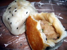 ここのお店のモノは、豚肉入り1種類と、野菜?入り2種類あったが、取りあえず豚肉入りのものを2つ購入(1つ10元/35円)。ビニール袋に入れてくれたが、焼きたて熱々らしく、袋の中は既に湯気でくもっている。