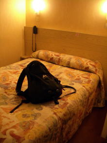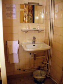 ◆エコノミーシングルルーム(シャワー・トイレ共同)は1泊55ユーロ(約7,700円)。朝食代金別。室内設備は、テレビ・机・イス・クローゼット・金庫・タオル・洗面シンク(写真右)。スタッフの対応は良く、英語が通じる。トイレは各階にあるが、シャワーはレセプションのある1階に1箇所あるのみ。