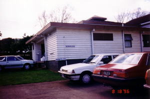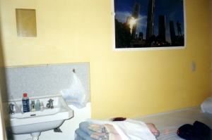 して、ここ(写真右)がワタシの部屋。上の写真のバックパッカーズの数少ないシングルルームのうちの1つ。料金は週NZ$120(1996年当時1NZ$=約76円)。忘れもしない33号室。1階にあって、右隣はバスルーム、左隣はフランス人のパスカルの部屋。室内には、クローゼットに写真にも写っている小さなベッド、このベッドの足元に洗面台(写真左下)がある。