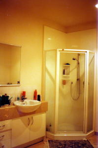 上の写真にあるキッチンとそこに繋がる広いリビングルーム、そしてこの写真のバスルーム!このバスルームは、シャワーブースの他に、バスタブもあるし、洗濯機に乾燥機、洗面シンクは2つも付いている。ウレシイのは、トイレが別になっているところ・・・・